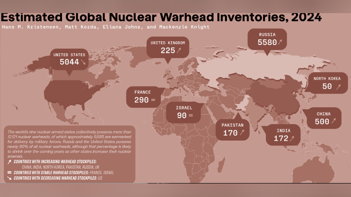 அணுஆயுதங்கள் மூலம் மோதல் வெடித்தால் அது பெரும் சேதத்தை ஏற்படுத்தும். இதனால் உலக நாடுகளும் ரஷ்யாவின் செயல்பாட்டை உன்னிப்பாக கவனிக்க தொடங்கி உள்ளன. இந்நிலையில் தான் உலகில் எந்த நாட்டில் அதிக அணு ஆயுதங்கள் உள்ளது. குறிப்பாக ரஷ்யா, அமெரிக்காவிடம் எவ்வளவு அணுஆயுதங்கள் உள்ளது? என்பது பற்றிய முக்கிய விபரம் வெளியாகி உள்ளது. இதுதொடர்பாக எப்ஏஎஸ் (FAS) எனும் Federation of American scientists இணையதளம் 2024ம் ஆண்டின் அடிப்படையில் கூறியுள்ளதாவது: 2024ம் ஆண்டின் நிலவரப்படி ரஷ்யா, அமெரிக்கா, சீனா, பிரான்ஸ், பிரிட்டன் இந்தியா, பாகிஸ்தான், இஸ்ரேல், வடகொரியா என்று மொத்தம் 9 நாடுகளிடம் அணுஆயுதங்கள் உள்ளன.