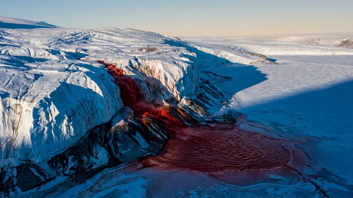 நம்மில் அனைவருக்கும் அண்டார்டிகா என்றதும் அங்குள்ள வெள்ளை நிற பனிக்கட்டிகள் தான் நினைவுக்கு வரும். எங்குப் பார்த்தாலும் இதுபோல வெள்ளை கலர் பனிக்கட்டிகளே இருக்கும். ஆனால், இப்படி எங்கு பார்த்தாலும் வெள்ளை நிறம் படர்ந்து இருக்கும் அண்டார்டிகாவில் ஒரு இடத்தில் மட்டும் ரத்தத்தை போலச் சிவப்பு கலரில் அருவி பீறிட்டுத் தெறிக்கிறது.