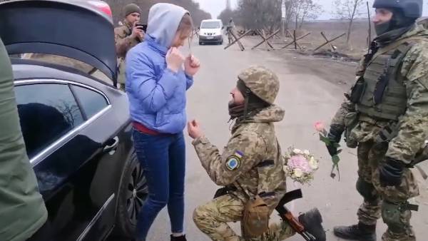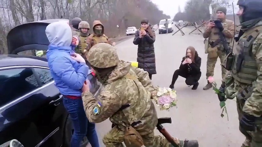 மண்டியிட்டு, தன்னுடைய காதலை வெளிப்படுத்தினார் அந்த உக்ரைன் ராணுவ வீரர். மற்றொரு கையில் இருந்த பூங்கொத்தை கொடுத்து, தன்னுடைய காதலை ஏற்றுக்கொள்ளச் சொன்னார். அந்தப் பெண், தன்னோடு வந்திருந்த குடும்பத்தையும், காதலை வெளிப்படுத்தும் ராணுவ வீரரையும் மாறி மாறி பார்த்து வெட்கப்பட்டாள்.