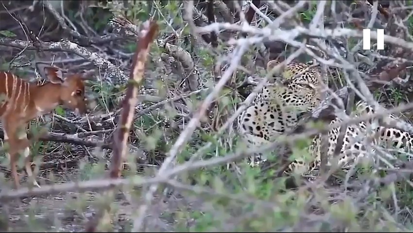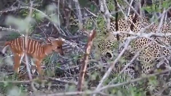 மாலை நேரத்தில் நையலா என்று அழைக்கப்படும் தென் ஆப்பிரிக்க இன மான் குட்டி ஒன்று காட்டில் நடந்து வந்தது. அப்போது பாதையில் சிறுத்தை அங்கு படுத்திருந்தது.