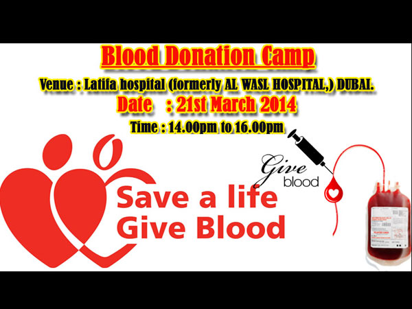 துபாயில் உள்ள லதீபா மருத்துவமனையில் வரும் 21ம் தேதி ரத்ததான முகாம் நடைபெறுகிறது. மதியம் 2 மணிக்கு துவங்கும் முகாம் மலை 5 மணி வரை நடைபெறுகிறது.
