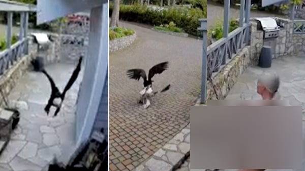அந்தச் சமயத்தில் எங்கோ இருந்து வந்த கழுகு ஒன்று வாத்தின் கழுத்தைக் கவ்விச் செல்ல முயல்கிறது. அந்த கழுகிடம் இருந்து தப்பிக்க வாத்து எவ்வளவோ முயல்கிறது. இருப்பினும், அந்த வாத்தால் இது முடியவில்லை. வீட்டின் உள்ளே தனது 4 மாத குழந்தைக்குப் பால் கொடுத்துக் கொண்டு இருந்த கெய்ட் ஓக்லி, இதைப் பாதுகாப்பு கேமராவில் பார்த்துப் பதறிவிட்டார்.