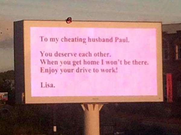 அதனைத் தொடர்ந்து தனக்கு துரோகம் செய்த கணவரை அவமானப்படுத்த திட்டமிட்டார் லிசா. அதற்காக தினமும் பால் அலுவலகம் செல்லும் பரபரப்பான சாலையில் 15 அடி உயர பெரிய விளம்பரப் பலனை ஒன்றை வைத்தார்.