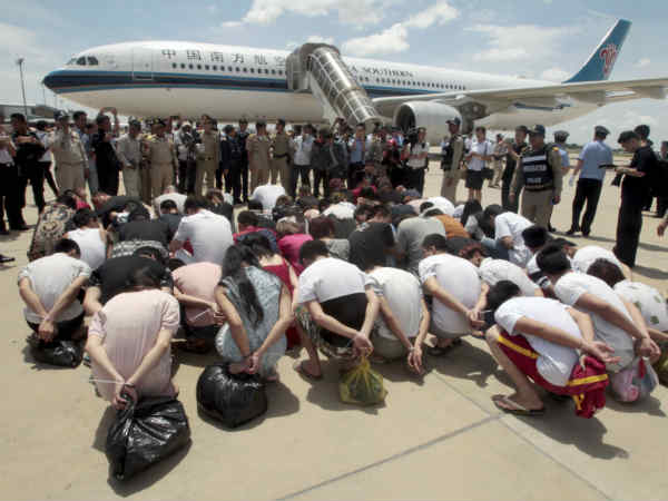 ஆனால் பிடிபட்ட சீன மோசடி மன்னர்களை தங்கள் நாட்டுக்கு அனுப்ப வேண்டும் அந்நாட்டு அரசு தொடர்ந்து கோரிக்கை விடுத்தது. இதையடுத்து அவர்களின் கைகளை கட்டி அந்நாட்டு போலீசார் விமானம் மூலம் அனுப்பி வைத்தனர்.