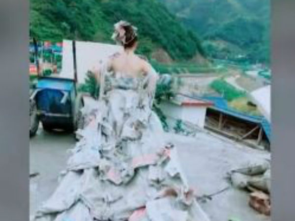 சீனாவில் சிமெண்ட் சாக்குகளை கொண்டு தயாரிக்கப்பட்ட உடையை திருமண ஆடையாக மணப்பெண் அணிந்து கொண்ட விசித்திரமான சம்பவம் அரங்கேறியுள்ளது.