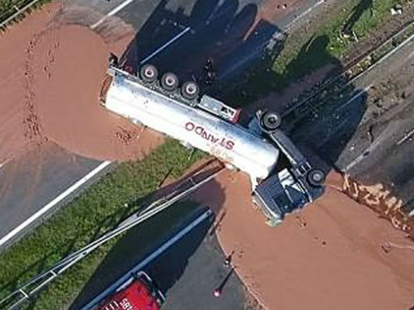 டேங்கர் லாரி ஒன்று விபத்துக்குள்ளானதை அடுத்து, அதில் இருந்த 12 டன் சாக்லேட் குவியல் மொத்தமும் சாலையில் கொட்டி இருக்கிறது. இதனால் அந்த சாலை மொத்தமாக பாதிக்கப்பட்டு போக்குவரத்து நிறுத்தப்பட்டுள்ளது.