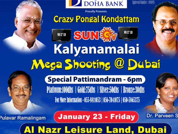 தோஹா வங்கி வழங்கும் கிரேஸி பொங்கல் கொண்டாட்டம், சன் டிவியின் கல்யாண மாலை மெகா ஷூட்டிங் வரும் 23ம் தேதி துபாயில் உள்ள அல் நஸ்ர் லீஷர் லேண்டில் நடைபெறுகிறது.