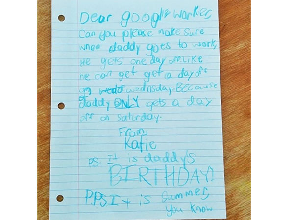பிரபல சர்ச் எஞ்சினான கூகுளின் தலைமையகம் அமெரிக்காவில் உள்ள கலிபோர்னியா மாகாணத்தில் இயங்கி வருகிறது. இந்த அலுவலகத்தில் வேலை பார்க்கும் ஊழியர் ஒருவரின் மகள் சமீபத்தில் அந்நிறுவனத்தின் நிறுவனரான டேனியல் ஷிப்லேகாப்பிற்கு தனது மழலை கையெழுத்தால் கடிதம் ஒன்றை எழுதியுள்ளார்.