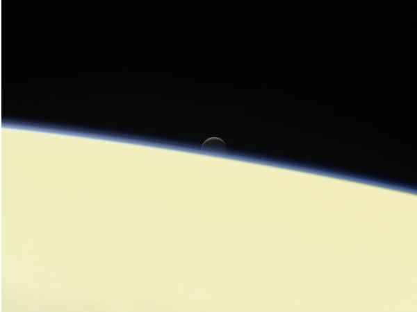 சனி கிரகத்தின் நிலவுகளில் சிறியதான என்செலாடஸை இந்தப் படத்தில் பார்க்கலாம். பிரமாண்ட சனி கிரகத்திற்குப் பின்னே மறைந்தபடி காணப்படுகிறது இந்த குட்டி நிலவு. காசினி எடுத்த கடைசிப் படங்களில் இதுவும் ஒன்று.