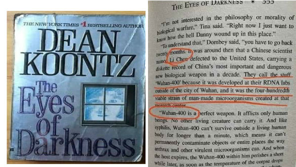 1981ஆம் ஆண்டில் டீன் கூன்ட்ஸ் எழுதிய த்ரில்லர் நாவலான தி ஐஸ் ஆஃப் டார்க்னஸ் (The Eyes of Darkness), வுஹான் -400 என்ற வைரஸைக் குறிப்பிட்டுள்ளது. நாவலின் கதைப்படி, அந்த வைரஸ் ஒரு ஆய்வகத்தில் ஆயுதமாக உருவாக்கப்பட்டதாக குறிப்பிடப்பட்டுள்ளது.