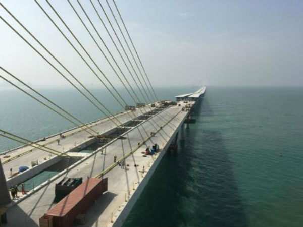 இந்த பாலம் 36 கிலோ மீட்டர் நீளத்திற்கு கட்டப்பட்டு இருக்கிறது. இதில் 27 கிலோ மீட்டர் பாலம் கடலில் கட்டப்பட்டுள்ளது. இந்த பாலத்தை கட்ட 5 வருடங்கள் ஆகியுள்ளன. 2013 நவம்பரில் இந்த பாலத்தை கட்ட தொடங்கி இருக்கிறார்கள். சுமார் 300 கோடி டாலர் செலவில் இந்தப் பாலம் கட்டப்பட்டுள்ளது. கடலுக்கு நடுவில் பெரிய அளவில் தூண்கள் நிறுத்தப்பட்டு பாலம் அமைக்கபட்டுள்ளது.