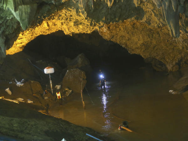 அவர்கள் அங்கு சென்ற போது கனமழை கொட்டியது. இதையடுத்து அவர்களால் வெளியேற முடியவில்லை. குகையானது 10 கி.மீ. நீளம் உடைய குகையில் வெள்ள நீர் புகுந்து விட்டது. குகையும் குறுகலாக இருந்தது.