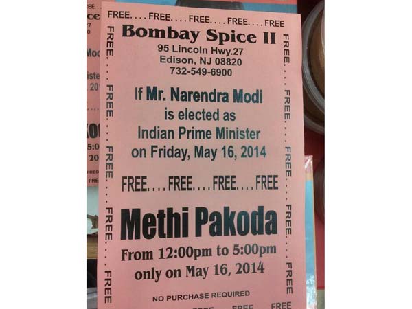 நியூஜெர்சி: நியூ ஜெர்சியில் உள்ள இந்திய உணவகம் ஒன்று மோடி பிரதமர் ஆனால் மே 16ம் தேதி அன்று அனைவருக்கும் வெந்தயக்கீரை பக்கோடா இலவசம் என்று அறிவித்துள்ளது.