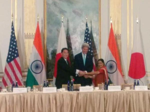 — Vikas Swarup (@MEAIndia) September 29, 2015 இந்த நிலையில் நியூயார்க்கில் இந்திய வெளியுறவுத் துறை அமைச்சர் சுஷ்மா ஸ்வராஜ், அமெரிக்க வெளியுறவுத் துறை அமைச்சர் ஜான் கெர்ரி, ஜப்பான் வெளியுறவுத் துறை அமைச்சர் ஃபியூமியோ கிஷிடா ஆகியோர் பங்கேற்ற 3 நாடுகளின் முதலாவது கூட்டு ஆலோசனைக் கூட்டம் நடைபெற்றது.
