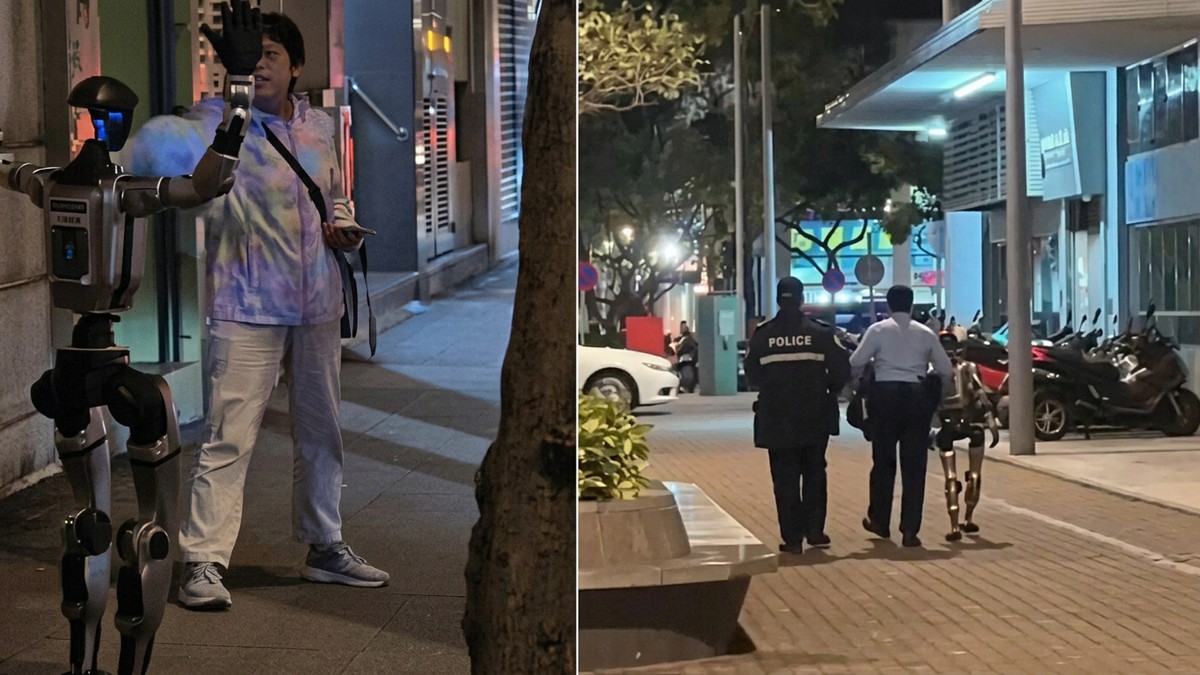 One night in Macau, a citizen was taking a walk with his humanoid robot (Unitree G1).