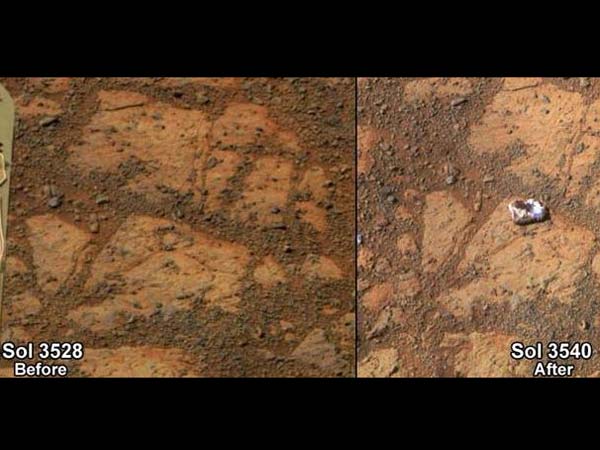 சமீபத்தில் ஒரு சிறிய பாறை போன்ற துண்டின் வடிவத்தை படம் பிடித்து நாசாவுக்கு அனுப்பி வைத்துள்ளது ஆப்பர்சூனிட்டி. இந்த மாதிரியான பாறை, செவ்வாய் கிரகத்தின் தரைப்பரப்பில் வேறு எங்கும் இதுவரை பார்க்கப்படவில்லை என்பதால் இது கியூரியாசிட்டியை தூண்டி விட்டுள்ளது.