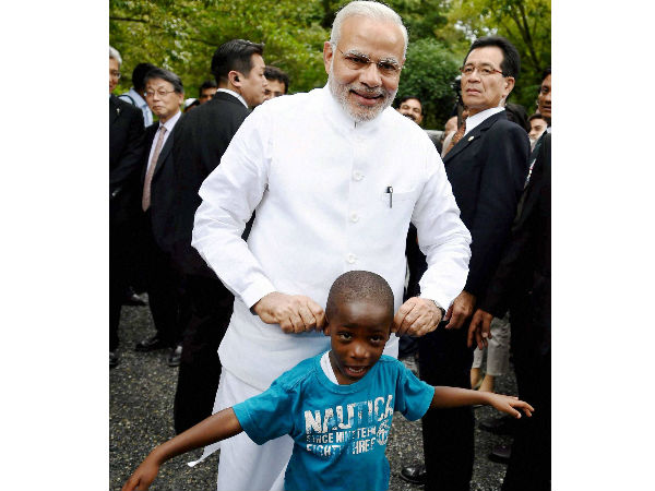 கின்காகுஜி கோவிலுக்கு சென்ற மோடி அங்கு ஒரு ஆப்பிரிக்க சிறுவனின் காதை பிடித்து இழுத்தபடி போட்டோவுக்கு போஸ் கொடுத்துள்ளார்.