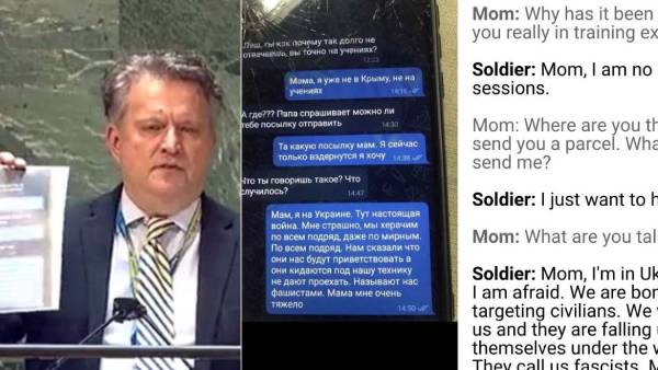 ரஷ்யாவின் ராணுவ வீரர் ஒருவருக்கு அவரது தாய் குறுஞ்செய்தி செய்கிறார். அதில், ‛‛ஏன் நீண்டகாலமாக குறுஞ்செய்தி அனுப்பவில்லை. உனக்கான பார்சல் அனுப்பவா'' என கேட்கிறார். இதற்கு அந்த ரஷ்ய வீரர், ‛‛ நான் கிரிமியாவில் இல்லை. தற்போது நான் உக்ரைனில் இருக்கிறேன். இங்கு உண்மையான போர் நடந்து வருகிறது. நான் பயந்துள்ளேன். நாங்கள் உக்ரைன் நகர் மட்டுமின்றி பொதுமக்களையும் குறிவைத்து குண்டுகள் வீசி வருகிறோம். உக்ரைன் மக்கள் எங்களை வரவேற்பார்கள் என்று ரஷ்யாவில் தெரிவிக்கப்பட்டது. ஆனால் அவர்கள் எங்களின் வாகனங்களின் முன்பு விழுந்து எங்களை தடுத்து நிறுத்துகிறார்கள். அவர்கள் எங்களை பாசிஸ்டுகள் (பொதுவுடமை எதிர்ப்பாளர்கள்) என கூறுகின்றனர். அம்மா இது மிகவும் கொடுமையானதாக உள்ளது. நான் தூக்கிட்டு தற்கொலை செய்து கொள்ள விரும்புகிறேன்'' என குறுஞ்செய்திகள் அனுப்பியுள்ளார். அதன்பின் அவர் இறந்தார்.
