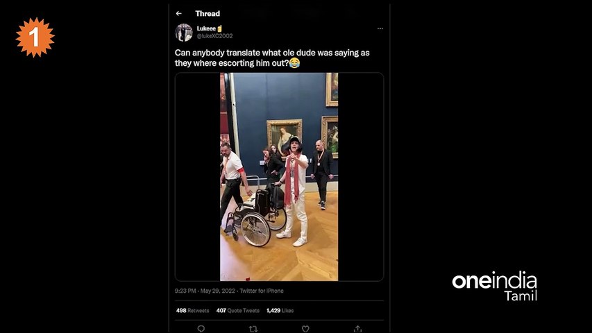 திடீரென வீல் சேரில் இருந்து எகிறி குதித்து உள்ளே போய்.. அந்த ஓவியத்தின் கண்ணாடி உரையை உடைக்க முயன்றார். ஆனால் அவரால் முடியவில்லை. அந்த கண்ணாடி புல்லட் பாதுகாப்பு கண்ணாடி ஆகும். இதனால் அந்த கண்ணாடியை அந்த மூதாட்டியால் உடைக்க முடியவில்லை. எவ்வளவு முயன்றும் கண்ணாடியை அவர் உடைக்க முடியாத நிலையில், பாக்கெட்டில் இருந்த கேக்கை வெளியே எடுத்தார்.