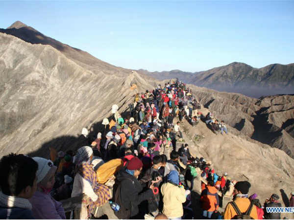 இந்தோனேசியாவில் உள்ள மவுண்ட் பரோமா எரிமலை மீது மக்கள் ஏறி நின்று காணிக்கைகளை சமர்ப்பித்து வித்தியாசமான சடங்கு செய்துள்ளனர்.
