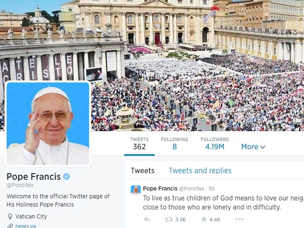 போப்பாண்டவரின் at @Pontifex என்ற பக்கத்தை கிட்டத்தட்ட 1.4 கோடி பேர் பின் தொடருகிறார்கள். அவர் போடும் ஒவ்வொரு டிவிட்டும், சராசரியாக 17,000 முறை ரீட்வீட் செய்யப்படுகிறது.
