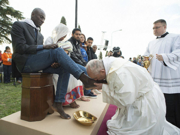 புனித வியாழன் அன்று போப் ஆண்டவர் 12 பேரின் பாதங்களை கழுவி முத்தமிடுவது வழக்கம். அதன்படி இத்தாலியின் ரோம் அருகே உள்ள அகதிகள் முகாமிற்கு சென்ற போப் பிரான்சிஸ் அங்கிருந்த 4 பெண்கள் உள்பட 12 பேரின் பாதங்களை கழுவி முத்தமிட்டார்.