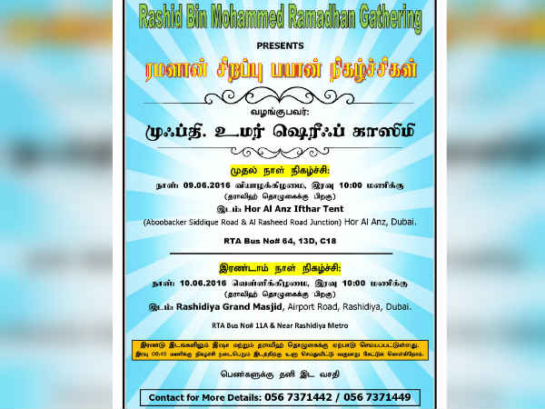 இரண்டு இடங்களிலும் இஷா மற்றும் தராவிஹ் தொழுகைக்கு ஏற்பாடு செய்யப்பட்டுள்ளது. இரவு 8.45 மணிக்கு நிகழ்ச்சி நடைபெறும் இடத்திற்கு உளு செய்துவிட்டு வருமாறு கேட்டுக்கொள்ளப்படுகிறார்கள். பெண்களுக்கு தனி இட வசதி செய்யப்பட்டுள்ளது.