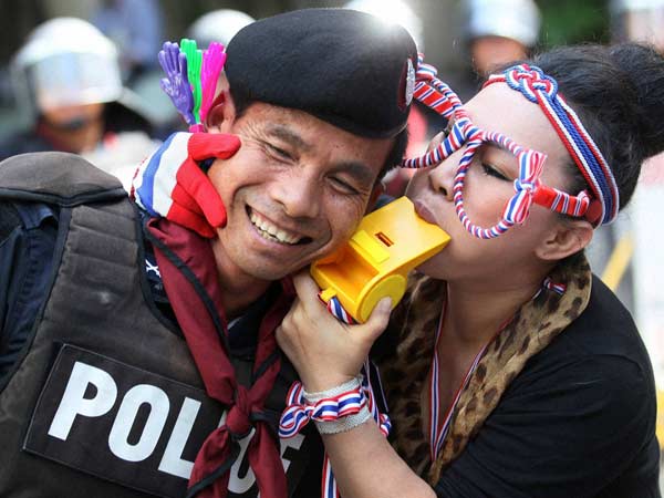 பாங்காக்: ஆர்ப்பாட்டக்காரர்களை அமைதிப் படுத்த புதிய டெக்னிக் ஒன்றைப் பயன் படுத்தியுள்ளனர் தாய்லாந்து போலீசார். அதன்படி, ஆயுதங்களைக் கீழே போட்டு விட்டு ஆர்ப்பாட்டக்காரர்களுடன் புகைப்படம் எடுத்து சமாதானத் தூது அனுப்பியுள்ளனர்.