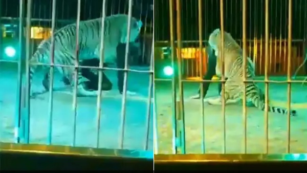 பயிற்சியாளரை புலி தாக்கும் வீடியோ தற்போது சமூக வலைதளங்களில் தீயாகப் பரவி பார்ப்பவர்களை பதைபதைக்கச் செய்து வருகிறது.