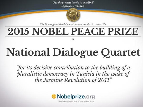 துனிசியா நாட்டின் தேசிய பேச்சுவார்த்தைக் குழுவுக்கு 2015ஆம் ஆண்டுக்கான அமைதிக்கான நோபல் பரிசு வழங்கப்படும் என்று அறிவிக்கப்பட்டுள்ளது.
