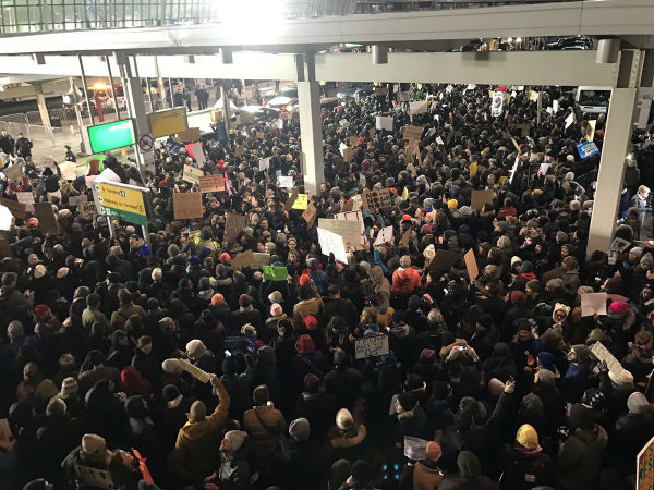 நியூயார்க் ஜான் எப் கென்னடி விமானநிலையத்தில் நூற்றுக்கணக்கானோர் திரண்டு போராட்டத்தில் ஈடுபட்டனர். இதுவரை இப்படி ஒரு போராட்டம் இங்கு நடந்ததில்ல என்று பலரும் டிவிட்டர் உள்ளிட்ட சமூக வலைதளங்களில் பதிவிட்டு வருகின்றனர்.