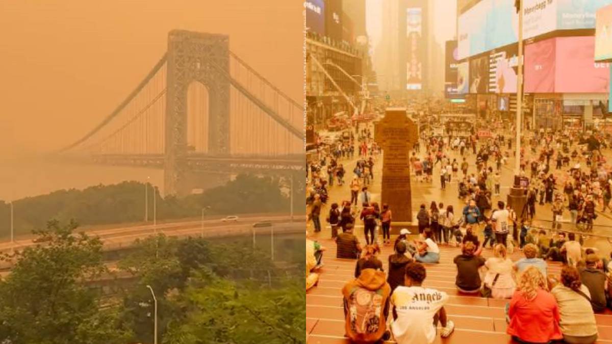 உலக அழிவை காட்டும் 2012 படம் போல அங்கே நியூயார்க் நகரம் காட்சி அளிக்கிறது. கிழக்கு கனடாவில் ஏற்பட்டு உள்ள காட்டுத் தீயில் இருந்து அபாயகரமான புகை மற்றும் துகள்கள் தெற்கே தொடர்ந்து நகர்வதால் நியூயார்க் மூச்சு விட முடியாமல் திணறி வருகிறது. இதனால் தொடர்ந்து இரண்டாவது நாளாக உலகின் மிக மோசமான காற்றின் தரம் கொண்ட நகரமாக நியூயார்க் நகரம் முதலிடத்தில் உள்ளது.
