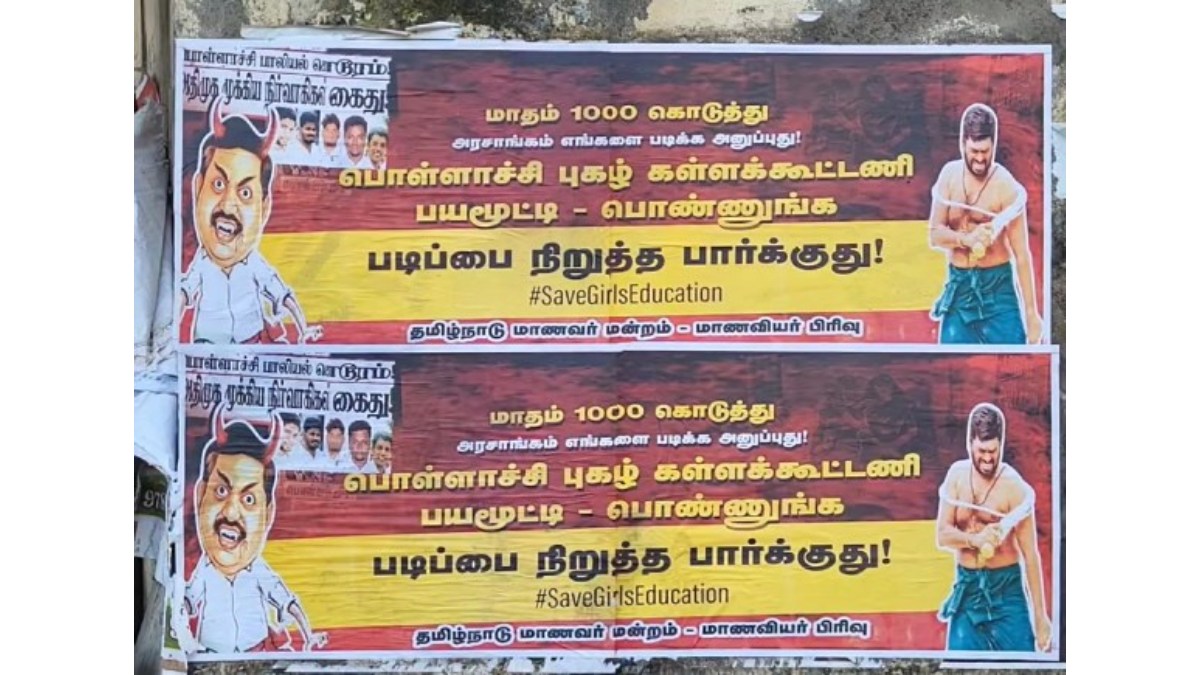 அதில், ''மாதம் 1000 கொடுத்து அரசாங்கம் எங்களை படிக்க அனுப்புது... பொள்ளாச்சி புகழ் கள்ளக்கூட்டணி பயமூட்டி பொண்ணுங்க படிப்பை நிறுத்த பார்க்குது'' சேவ் கேல்ஸ் எஜிகேசன் (SaveGirlsEducation) என ஒட்டப்பட்டிருந்தது.