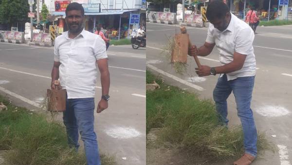 கரூர் தான்தோன்றிமலை அரசு கலைக் கல்லூரியின் வளாகத்தில் முன்புறம் டூ விலர்கள் நிறுத்தும் இடம் மற்றும் அவ்வழியாக செல்லும் சாலையின் ஓரத்தில் புற்கள் மற்றும் வேஸ்ட் பேப்பர்கள் கொட்டப்பட்டு குப்பைகளாக இருந்ததை கண்ட கல்லூரியின் உடற்கல்வித் துறை இயக்குநர் ராஜேந்திரன், உடனே அங்கிருந்து மம்பட்டியை எடுத்து தூய்மைப்படுத்தும் பணியினை துவக்கினார்.