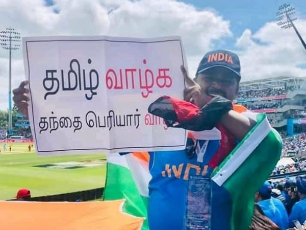 இதனிடையே எட்ஜ்பாஸ்டன் மைதானத்தில் நேற்று போட்டியை காண சென்ற கிரிக்கெட் ரசிகர், தமிழ் வாழ்க- தந்தை பெரியார் வாழ்க என்கிற பதாகையுடன் சமூக வலைதளங்களில் படம் ஒன்றை வெளியிட்டுள்ளார். இது தற்போது வைரலாக பரவி வருகிறது. தமிழகத்தில் ஒலித்த பெரியார் வாழ்க குரல் இந்தியா முழுவதும் ஒலித்தது; இப்போது உலகம் முழுவதும் ஒலிக்கவும் தொடங்கியிருக்கிறது என பெரியார் ஆதரவாளர்கள் பெருமிதத்துடன் இந்த படத்தை பகிர்ந்து வருகின்றனர்.