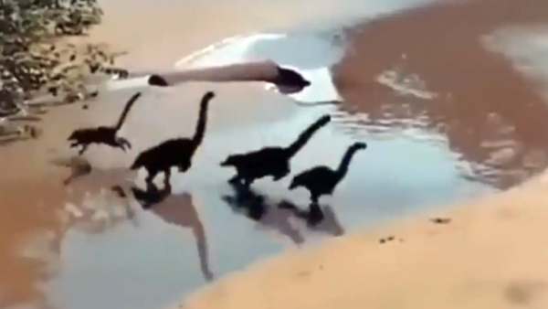 சம்பந்தப்பட்ட அந்த வீடியோவில் ஆற்றங்கரை ஒன்றில், நீண்ட கழுத்துடன் குட்டி குட்டி டைனோசர் போன்ற விலங்குகள் ஒருபுறமாக ஓடுகின்றன. அவை பார்ப்பதற்கு சௌரோபாட்கள் போல் காட்சியளிக்கின்றன. 14 விநாடிகள் மட்டுமே இந்த வீடியோ முதன்முறை பார்ப்பவர்கள் குழப்பத்தில் ஆழ்த்துகிறது.