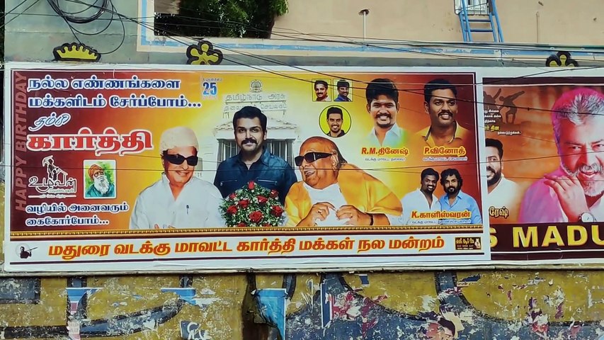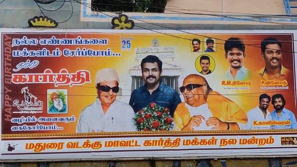 அந்த போஸ்டரில் நடிகர் கார்த்தி தலைமைச் செயலகம் முன்பு நிற்பது போல் உள்ளது. அவருக்கு வலது பக்கம் முன்னாள் முதல்வர் எம்ஜிஆரின் படமும் இடது பக்கம் மற்றொரு முன்னாள் முதல்வர் கருணாநிதியின் படமும் இடம்பெற்றுள்ளது. மதுரை வடக்கு மாவட்ட கார்த்தி மக்கள் நல மன்றத்தினர் இந்த போஸ்டரை ஒட்டியுள்ளனர்.