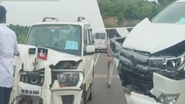 கார்கள் வேகமாக வந்த நிலையில், முன்னால் சென்ற கார் திடீரென டிராபிக் காரணமாக பிரேக் அடித்தது. 50 மீட்டர் இடைவெளி கூட விடாமல் அருகருகே கார்கள் சென்றதால் பின்னால் வந்த காரர்களால் பிரேக் போட முடியவில்லை. இதனால வரிசையாக கார்கள் மோதின. இதனால் அதிமுக கொடி கட்டிய கார்கள் 4 வரிசையாக மோதி முன் பக்கம் கடுமையாக சேதம் அடைந்தன.
