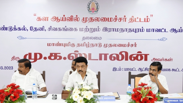 மதுரை மாவட்ட ஆட்சியர் அலுவலகத்தில், மதுரை, இராமநாதபுரம், திண்டுக்கல், சிவகங்கை மற்றும் தேனி மாவட்டங்களைச் சார்ந்த தொழிற் சங்கங்கள், சிறு மற்றும் குறுந்தொழிற் சங்கங்கள், விவசாய சங்கங்கள், மீனவர் சங்கங்கள் போன்ற சங்கங்களின் பிரதிநிதிகளுடன் கலந்துரையாடி, அவர்களின் கோரிக்கைகள் குறித்து கேட்டறிந்தார் முதல்வர் ஸ்டாலின். பின்னர் நேற்று மாலை மதுரை மாவட்ட ஆட்சியர் அலுவலகத்தில், மதுரை, இராமநாதபுரம், திண்டுக்கல், சிவகங்கை மற்றும் தேனி மாவட்டங்களின் காவல்துறை உயர் அலுவலர்களுடன் சட்டம் ஒழுங்கு தொடர்பாக தமிழ்நாடு முதலமைச்சர் தலைமையில் ஆய்வுக் கூட்டம் நடைபெற்றது. அதன் தொடர்ச்சியாக இரண்டாவது நாளாக இன்று தமிழ்நாடு முதலமைச்சர் மு.க.ஸ்டாலின் தலைமையில் மதுரை மாவட்ட ஆட்சியர் அலுவலகத்தில், "கள ஆய்வில் முதலமைச்சர்" திட்டத்தின் கீழ் மதுரை, இராமநாதபுரம், திண்டுக்கல், சிவகங்கை மற்றும் தேனி மாவட்டங்களின் மாவட்ட ஆட்சித் தலைவர்கள் மற்றும் அரசு உயர் அலுவலர்களுடன் ஆய்வுக் கூட்டம் நடைபெற்றது.