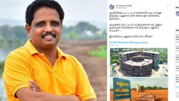 இதனையும், மதுரை எய்ம்ஸ் மருத்துவமனை அமைய இருக்கும் இடத்தில் உள்ள போர்டையும் ட்விட்டரில் பகிர்ந்த எம்.பி. சு.வெங்கடேசன், "அறிவிக்கப்பட்ட 8 மாதங்களில் உயர்ந்து நிற்கும் மதுரையின் கலைஞர் நினைவு நூலகம்... அடிக்கல் நாட்டி 40 மாதங்களை கடந்தும் ஒற்றைச் செங்கலோடு நிற்கும் மதுரை எய்ம்ஸ்... இரண்டும் மதுரையின் சாட்சிகள்!" என்று பதிவிட்டு இருந்தார்.