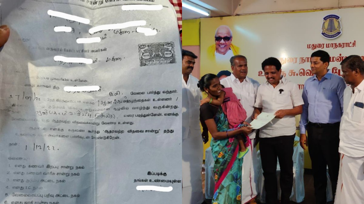 இந்நிலையில் ஒரு பெண் ஆறுமாதமாக விதவை சான்றிதழ் வாங்க முடியாமல் கை குழந்தையுடன் அலைந்து கொண்டிருந்திக்கிறார். அவருக்கு மதுரை எம்பி வெங்கடேசன் உதவி உள்ளார். இது தொடர்பாக அவர் வெளியிட்டுள்ள பதிவில், "முதல்வர் உத்தரவு பிறப்பிக்க வேண்டுகிறேன். மக்கள் சந்திப்பு இயக்கத்தில் ஒரு வயது கைக்குழந்தையோடு வந்த பெண் கலங்கிய கண்களோடு சொன்னார். "விதவை சான்றிதழுக்கு விண்ணப்பித்து 6 மாதமாகிவிட்டது. அலையாய் அலைகிறேன். கிடைக்கவில்லை" என்று அதிகாரிகள் ஏதேதோ காரணம் சொன்னார்கள்.