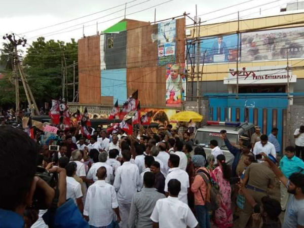 சர்கார் திரையிடப்பட்ட தியேட்டர் முற்றுகை.. எம்எல்ஏ தலைமையில் குவிந்த அதிமுகவினர்.. பதற்றம்