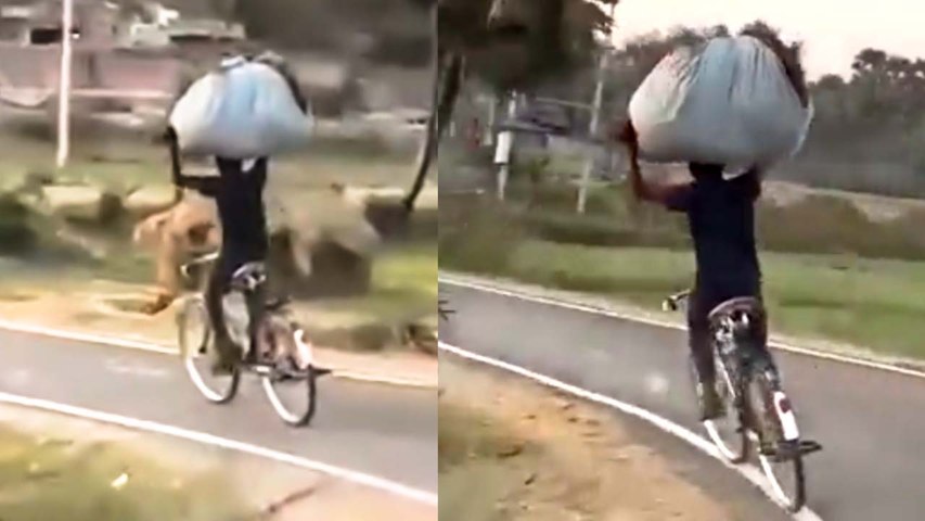 இந்த நிலையில் எந்த ஊர் என தெரியவில்லை. ஒருவர் தலையில் மிகப் பெரிய துணி மூட்டையை எடுத்துக் கொண்டு சைக்கிளில் அமருகிறார். இத்தனை பெரிய மூட்டையை வைத்துக் கொண்டு இவர் எப்படி சைக்கிளை ஓட்ட போகிறார் என நினைப்பவர்களுக்கு அதிர்ச்சி காத்திருக்கிறது.