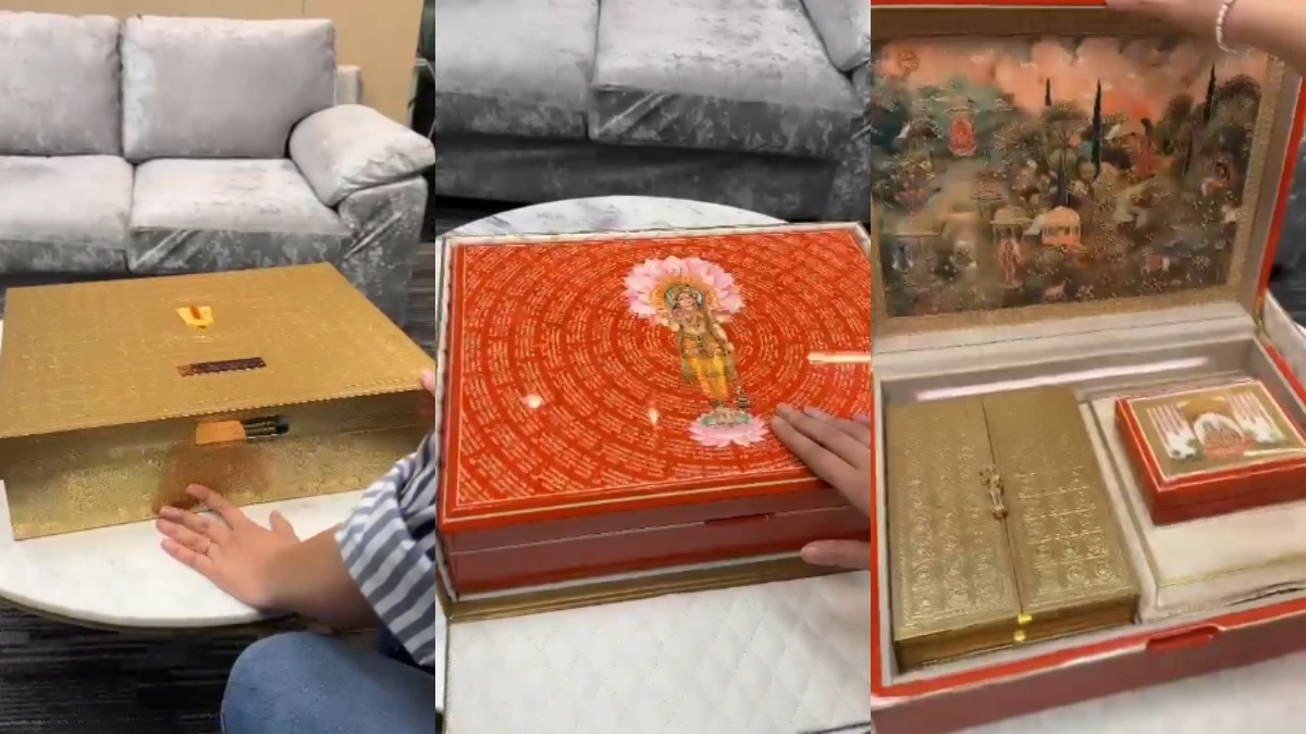 அதை திறந்தவுடன் திருமண விவரங்கள் தெய்வ உருவங்களுடன் அலங்கரிக்கப்பட்டுள்ளது. அழைப்பிதழை திறந்தவுடன் அதில் மங்கள இசையும் விஷ்ணு சகஸ் ஒலிக்கிறது. பெட்டியின் உள்ளே தெய்வங்களில் தங்கம், வெள்ளி முலாம் பூசப்பட்ட விக்கிரகங்கள் உள்ளன.