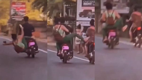 பின்னர் அவர்கள் தங்கள் வழியில் செல்ல, மோட்டார் சைக்கிளில் பின்னால் அமர்ந்திருந்த அந்தப் பெண்ணோ தங்களை பார்த்து செல்லுமாறு கூறிய இளைஞரின் மோட்டார் சைக்கிளை மிதிக்கிறார். ஆனால் அடுத்த நொடியே இவர் நிலைத்தடுமாறி ஓடிக்கொண்டிருந்த மோட்டார் சைக்கிளில் இருந்து தலைகுப்புற விழுகிறார். இதனை பின்னால் காரில் வந்த ஒருவர் தனது செல்போனில் வீடியோ எடுத்து சமூக வலைதளத்தில் பதிவிட அது தற்போது டிரெண்டாகி வருகிறது.