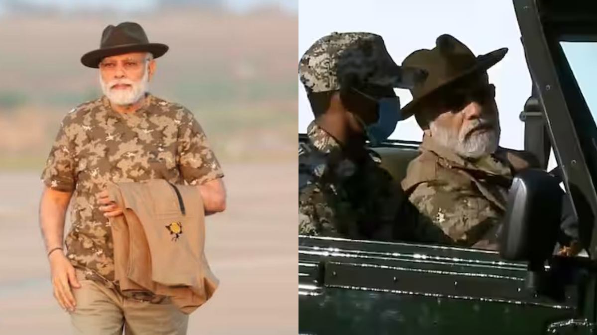 எப்போதும் கோர்ட், குர்தா உள்ளிட்ட ஆடைகளை அணிந்து இருக்கும் பிரதமர் மோடி இன்று டீசர்ட் அணிந்திருந்தார். அதாவது Camouflage cloth வகை ஆடை அணிந்திருந்தார். இந்த ஆடை என்பது பழுப்பு அல்லது பச்சை நிறங்களில் இருக்கும். அல்லது 2 நிறங்களும் சேர்ந்தே இருக்கும். இந்த ஆடைகளில் மரங்களின் இலைகள், கிளைகள் போன்ற வடிவங்கள் இடம்பெற்றுள்ளன.
