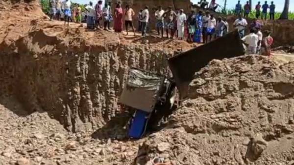 டிராக்டர் ஓட்டுனர் சுப்பிரமணி, மண்ணை அள்ளிக்கொண்டு சுமார் 30 அடி பள்ளத்தில் இருந்து மேலே சென்றுள்ளார். அப்போது எதிர்பாராத விதமாக டிராக்டர் பின்புறமாக திடீரென கவிழ்ந்து விழுந்து விழுந்தது. இந்த விபத்தில், டிராக்டரில் அமர்ந்திருந்த இரண்டு பெண்களும் பள்ளத்தில் விழுந்தனர். இதில் அவர்களுக்கு தலையில் பலத்த காயம் ஏற்பட்டது. மேலும் டிராக்டரில் இருந்த மண்ணும் அந்த பெண்கள் மீது கொட்டியதால், அவர்கள் மண்ணில் புதைந்தனர்.
