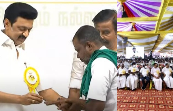 அதன்படி புதுச்சத்திரம் திமுக ஒன்றியச் செயலாளர் கவுதம், பந்தல் அமைத்த பந்தல் ராஜா, ஆர்ட் டைரக்டர் செல்வம், 10,000-க்கும் மேற்பட்ட உள்ளாட்சி பிரதிநிதிகளுக்கு காலை, மதியம் அறுசுவை உணவுடன் மாலை சிற்றூண்டியும் செய்து அசத்திய சமையல் மாஸ்டர் வெங்கடாஜலம் ஆகியோருக்கு தலா 1 சவரன் தங்க மோதிரம் அணிவித்து அவர்களை பெருமைப்படுத்தினார் முதலமைச்சர் ஸ்டாலின்.