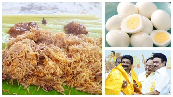 மட்டன் பிரியாணிக்காக 2 டன் அதாவது 2,000 கிலோ ஆட்டு இறைச்சி ஹலால் முறையில் கொள்முதல் செய்யப்பட்டது. பிரியாணியுடன் ஆனியன் பச்சடி, சிக்கன் வறுவல் சிலருக்கு, சிக்கன் கிரேவி சிலருக்கு பரிமாறப்பட்டிருக்கிறது. இதேபோல் எல்லோருக்கும் அவித்த முட்டை ஒன்றும் பிரியாணிக்கு தொட்டுக்கொள்ள கொடுக்கப்பட்டது. இதற்காக 10,000 முட்டைகள் தனியாக கொள்முதல் செய்யப்பட்டன. நாமக்கல் மாவட்டத்தை பொறுத்தவரை முட்டைக்கு பெயர் போன மாவட்டம் என்பதால் ராஜேஷ்குமாருக்கு இது பெரிதாக தெரியவில்லை.