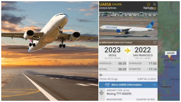 தென் கொரியாவில் நேற்று முன்தினம் நள்ளிரவு 12 மணிக்கு 2023 புத்தாண்டு பிறந்துள்ளது. இதனை அங்கிருந்த மக்கள் உற்சாகமாக கொண்டாடி இருக்கிறார்கள். இந்நிலையில், அங்குள்ள சியோல் நகரில் இருந்து அமெரிக்காவின் சான் பிரான்சிஸ்கோ நகரத்துக்கு 'தி யுனைட்டெய் ஏர்லைன்ஸ் போயிங் 777300' என்ற விமானம் நள்ளிரவு 12.30-க்கு புறப்பட்டுள்ளது. அதாவது புத்தாண்டு பிறந்து அரை மணிநேரம் கழித்து இந்த விமானம் புறப்பட்டுள்ளது.